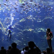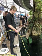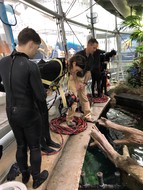 The Amazon exhibit is absolutely amazing to dive; diving with the arapaima was fantastic! One small fish, similar to a garibaldi, was irritated I was present within the tank, taking small nibbles at my boots. I learned that climbing over the glass tunnel in the exhibit is not so easy!
