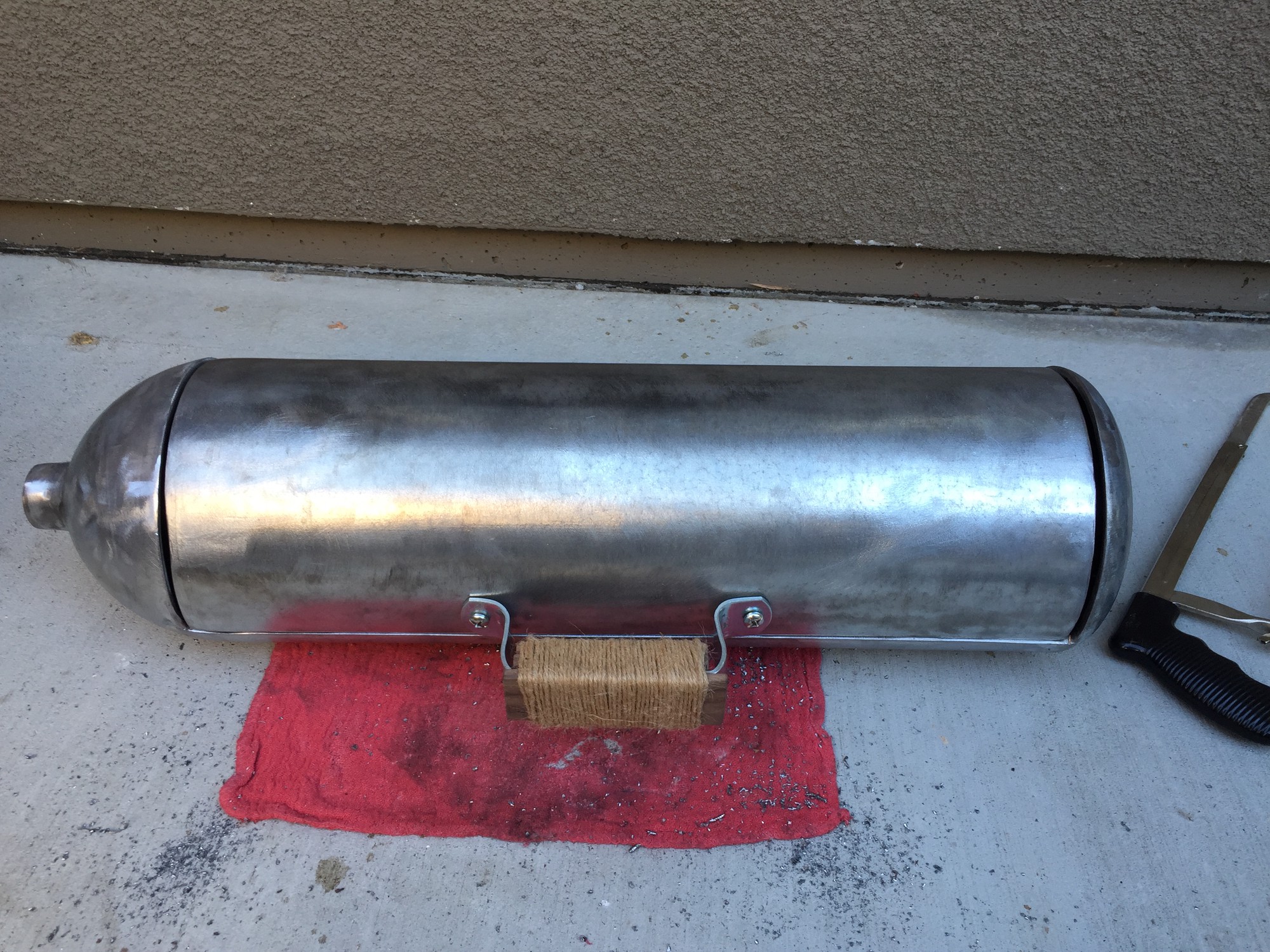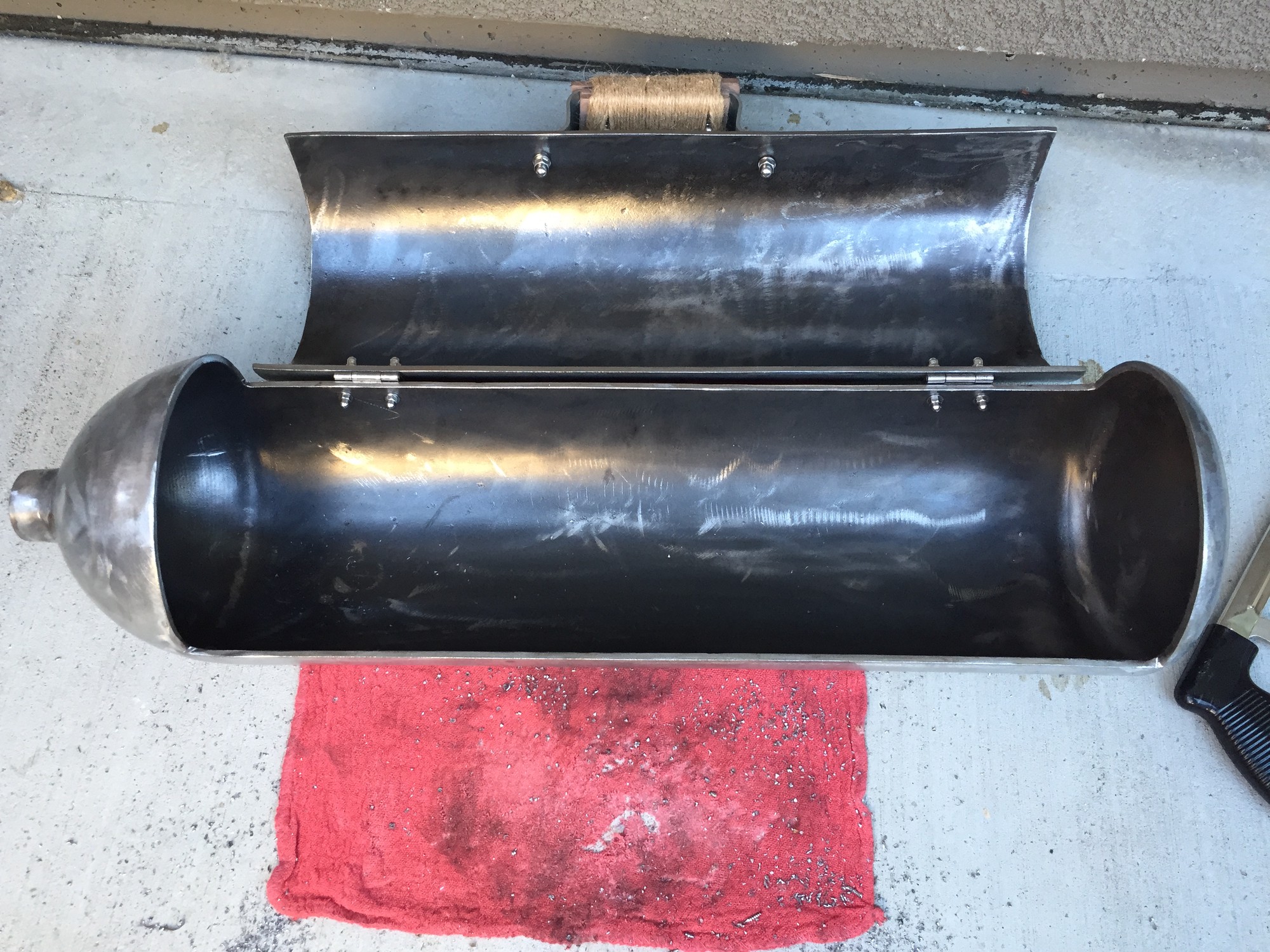 Reading through the fabrication process of scuba tanks and looking through forums on the potential safety issues with using a scuba tank as a grill (metal toxicity, etc)3, I couldn’t find any definitive information identifying this black film. It would wipe onto a rag, however I couldn’t manage to remove it with even the most vigorous wire brush scrubbing. Initially unable to remove it effectively, I decided to proceed with the project and deal with the film later.