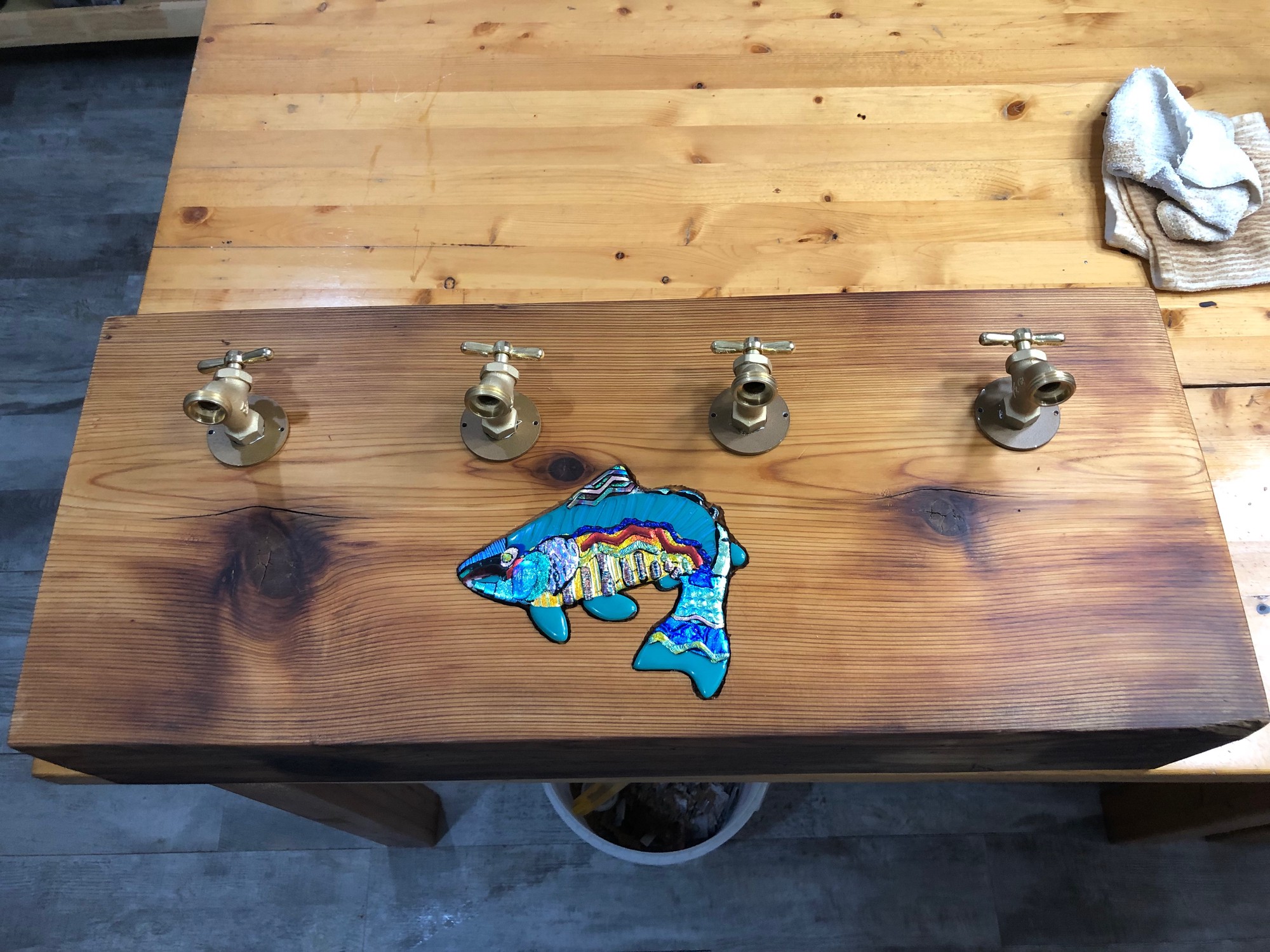 The glasswork was done by my mother and as the fish species I chose Rainbow Trout. It offers vibrant colors to work with. We adhered the glass trout to the carved shape using Marine Grade GOOP1.