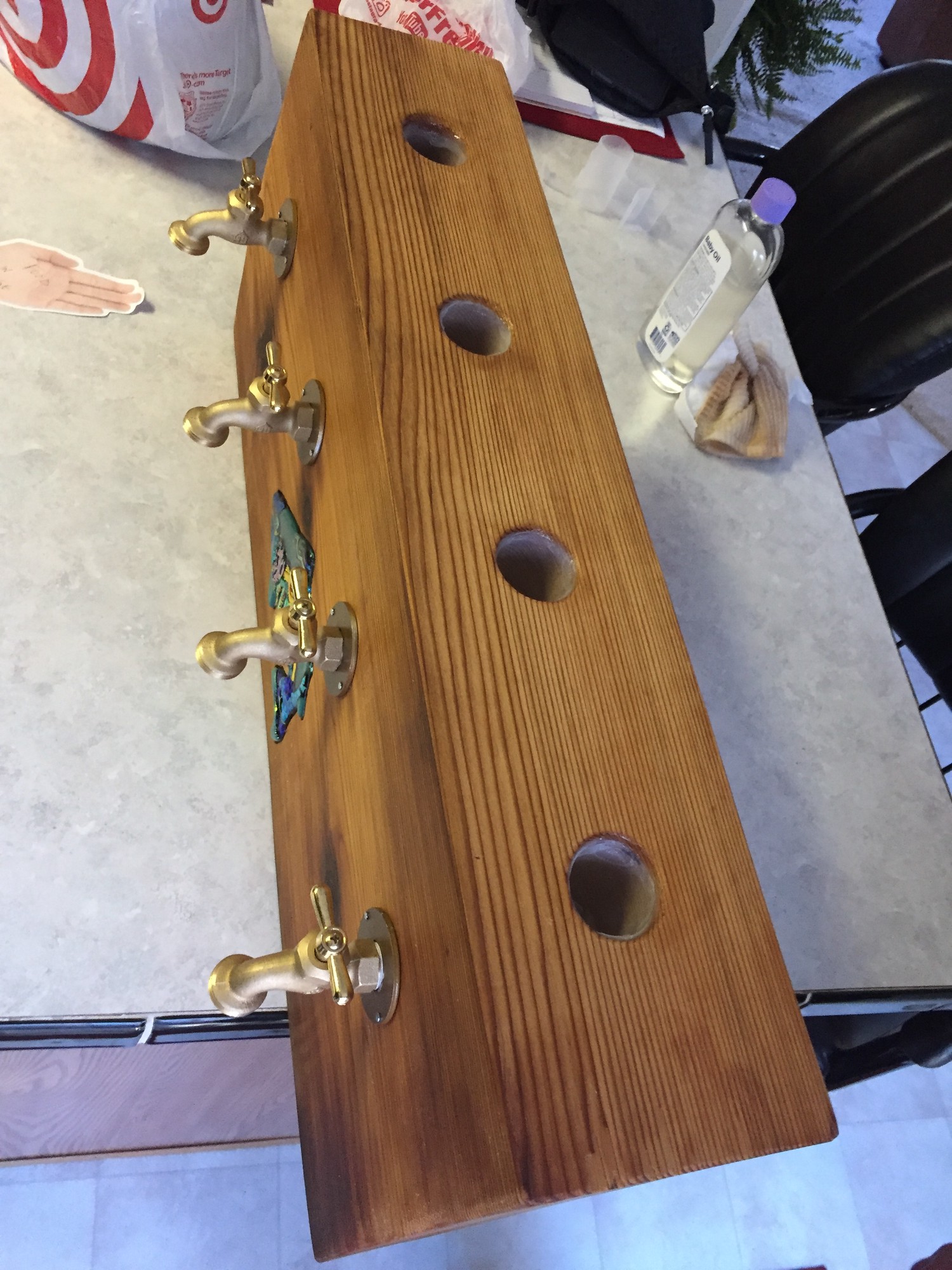 After completing this bar tap, I was so pleased with its results that I wanted to make one as a gift for my sister’s fiancee! It uses the same fabrication techniques and receptical/valve/tubing assemblies as that one so be sure to read through it for the general idea of how it works. This bar tap differs really only in cosmetics which I’ll cover below in detail.