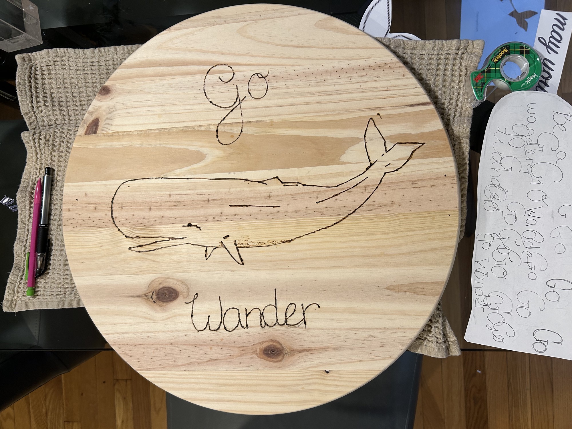 A whale design found on the internet was first printed on printer paper. The design profile was then cut from the paper followed by etching its outline onto the board using pencil. The lettering was freehand drawn using pencil.