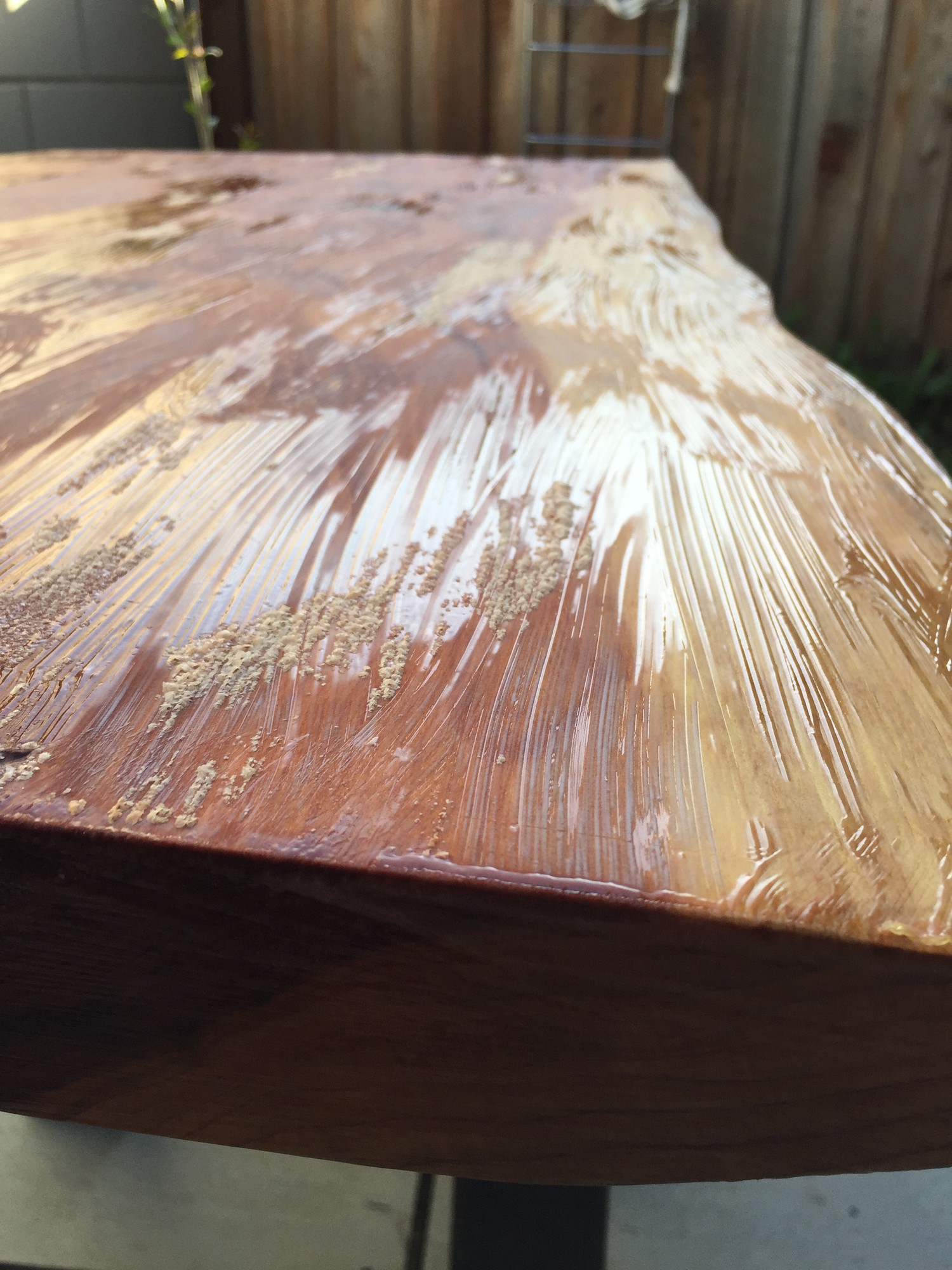 I discovered card scrapers take practice to use effectively. Combination of either too low or too high of an approach angle of the card to the wood and the naturally soft fibers of redwood, meant that creating divots were very easy. The removal of these divots was time consuming and amounted to resanding the wood in those areas using 120 grit sand paper. While the card scrapers provided an unparalleled smooth texture for the resin fills, they ulimately proved too difficult to use without creation of divots on the soft redwood. I instead resorted to sanding progressively from 80 grit up to 1200 grit as I had done in my previous project
